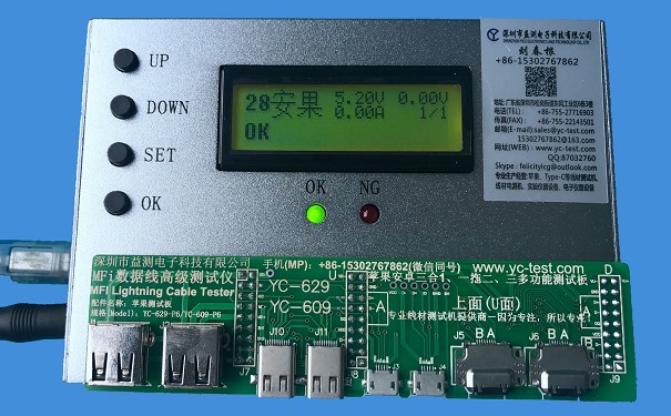 史上強大、準(zhǔn)確的蘋果數(shù)據(jù)線測試儀,業(yè)界權(quán)威,雙面測試,單頭測試,0-3A 電流實測,D+D-漏電阻檢測,支持C10、C48、C52、E75、C68、蘋果安卓2合1的線、蘋果安卓1拖2線、1拖3線.